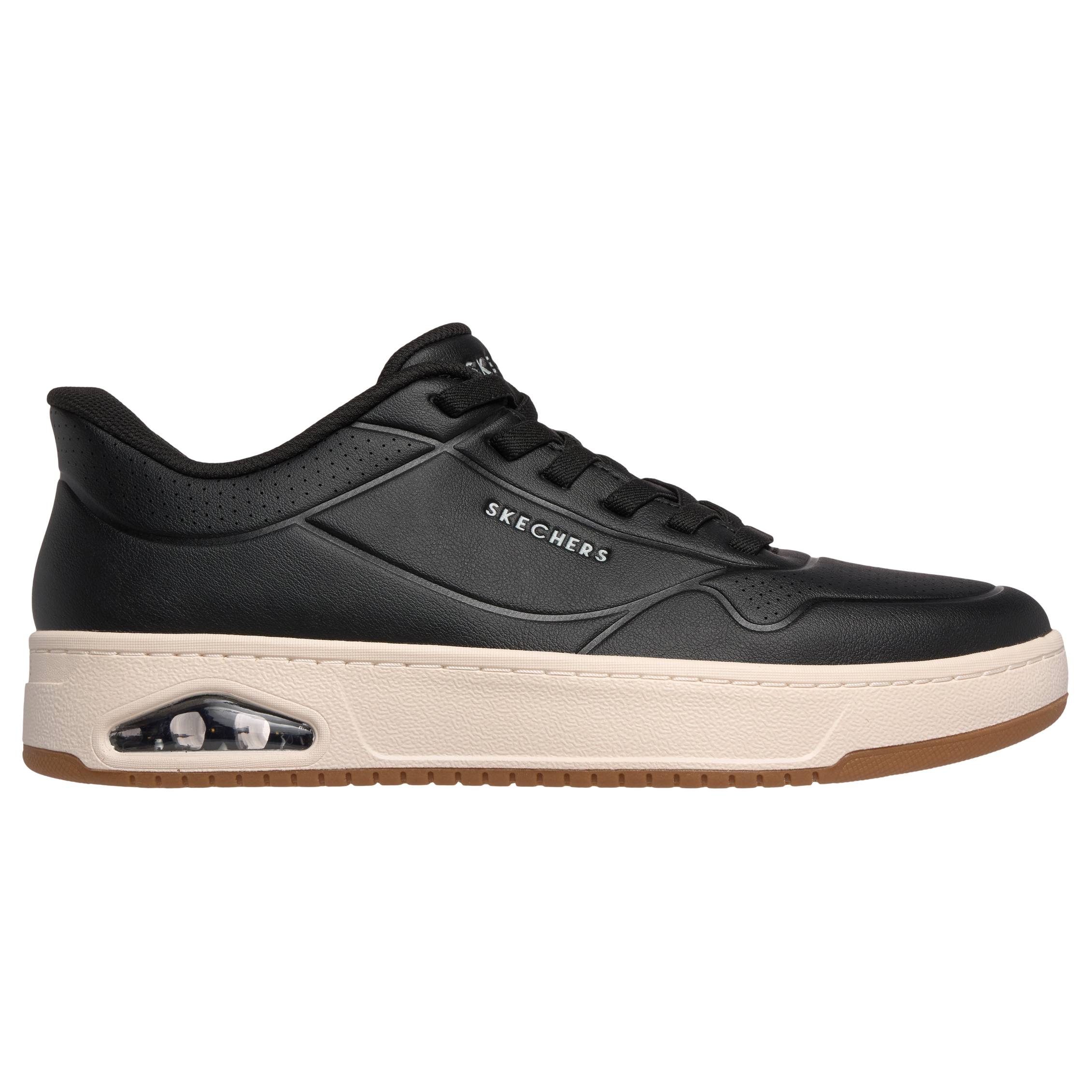 Heel Pillow®, debossed duraleather upper with perforated details, fixed stretch laces, cushioned Air-Cooled Memory Foam® insole, visible Skech-Air® airbag midsole.